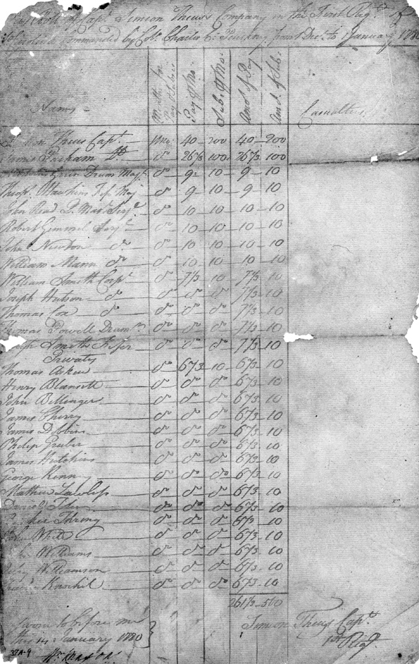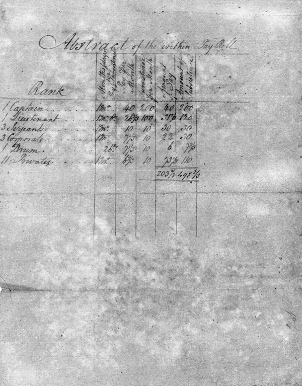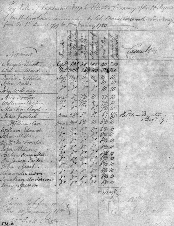 PAY ROLL OF CAPTAIN JOSEPH ELLIOTTS COMPANY IN THE FIRST REGIMENT OF SOUTH CAROLINA INFANTRY COMMANDED BY CHARLES COTESWORTH PINCKNEY (2 PAGES; PRINTED, SALLEY, DOCUMENTS… DURING THE REVOLUTIONARY WAR, PP. 22-23)