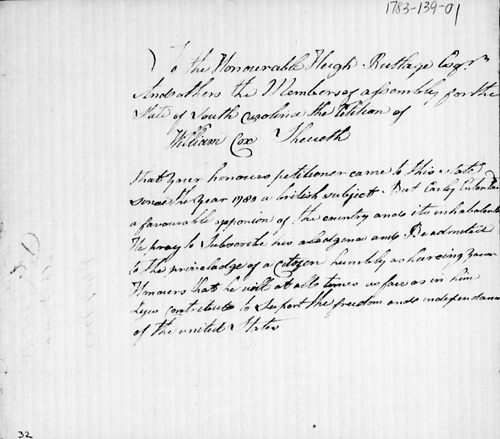 COX, WILLIAM, PETITION ASKING THAT HE MAY BECOME A CITIZEN OF THIS STATE. (2 PAGES)