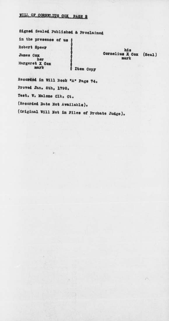 COX, CORNELIUS OF NINETY SIX DISTRICT, WILL TYPESCRIPT, NEWBERRY COUNTY (MSS WILL: ESTATE RECORD BOOK A, PAGE 74) (2 FRAMES).