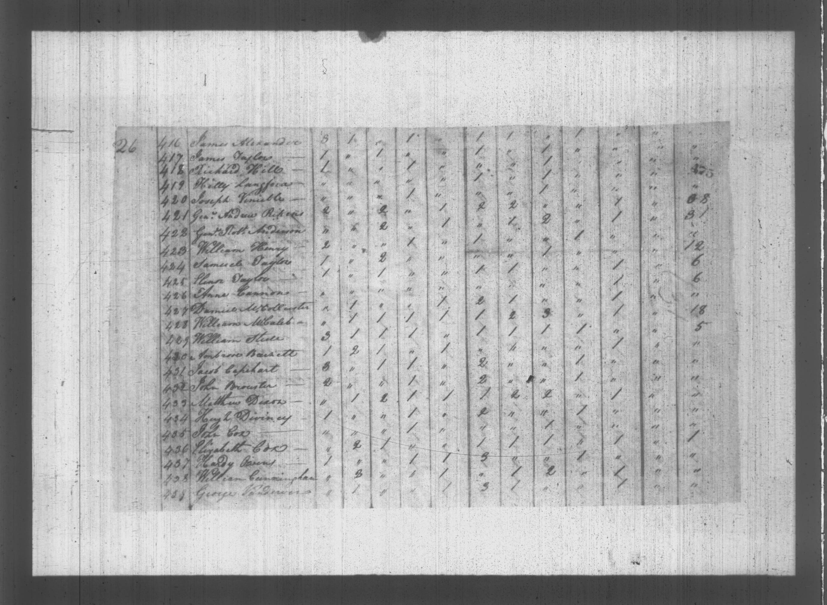 Page 135 (Line 24) Allen Blair 30/40 wife 30/40,males (1)5/10 & 2 under 5 + females (1)15/20, (2)10/15 (Joseph Allen Sr daughter?)