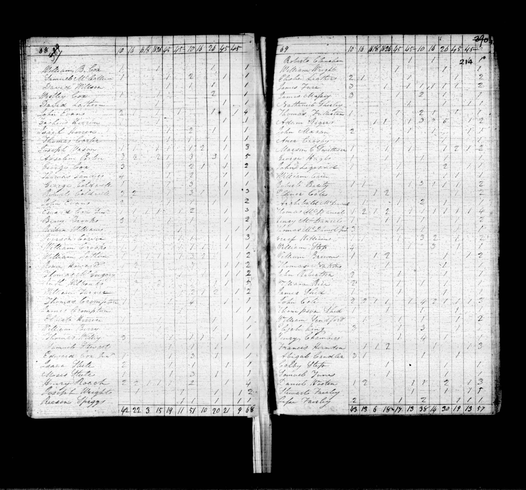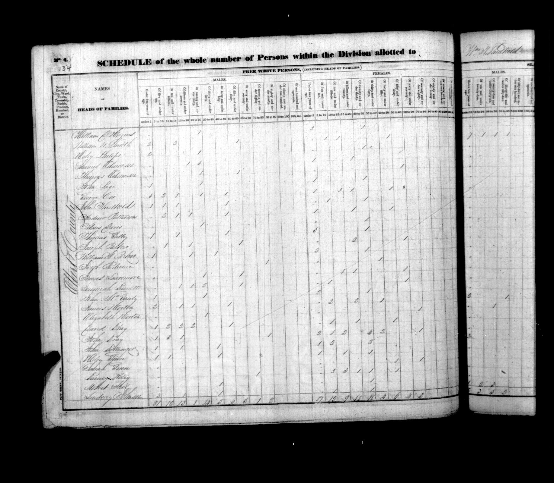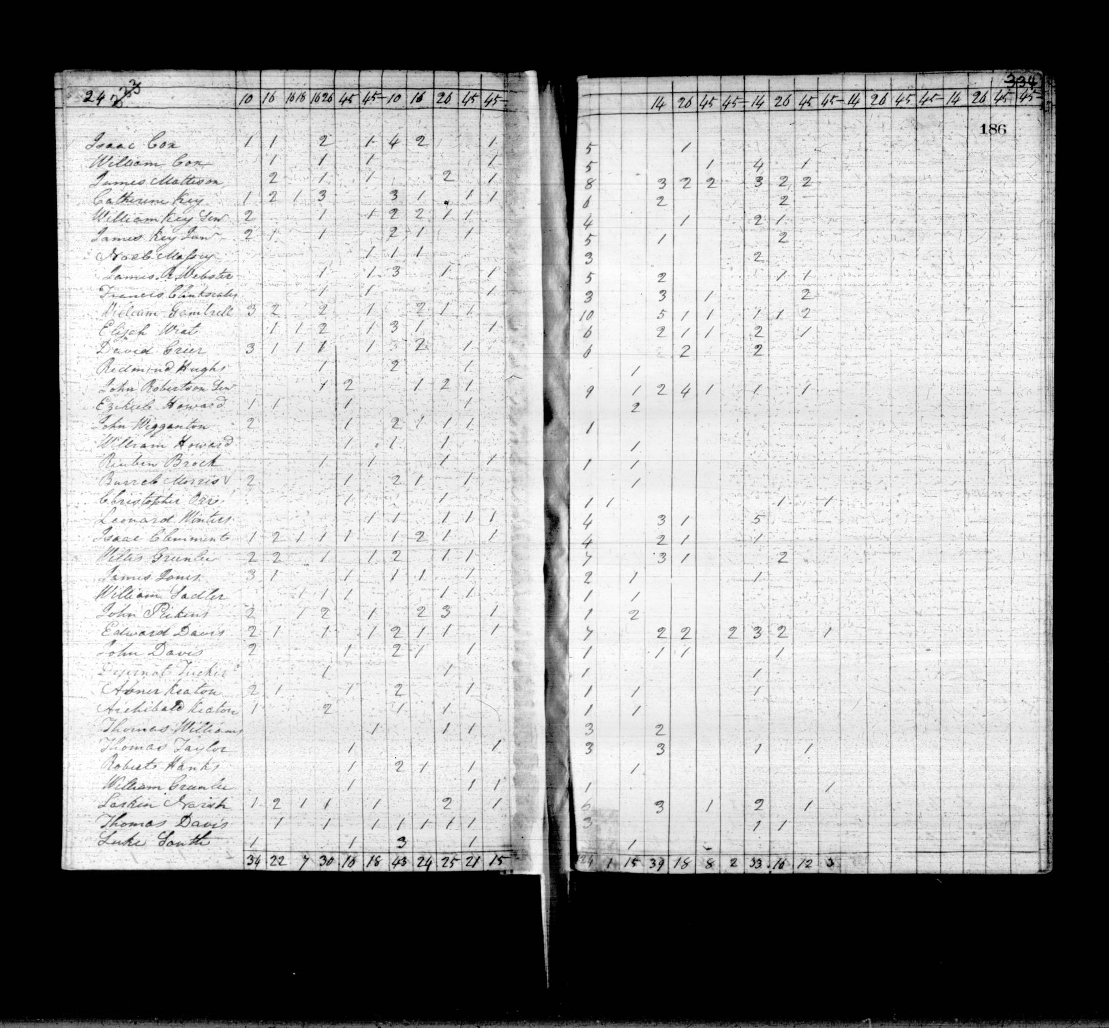 Page 134, line 7 - George Cox 40/50 wife 40/50,males (1)20/30, (1)10/15, (2)5/10 & 3 under 5 + females (1)15/20, (1)10/15 & 1 under 5 (Wm B sr brother - boy 20/30 may be Wm B jr and girl 15/20 could be Rhoda)