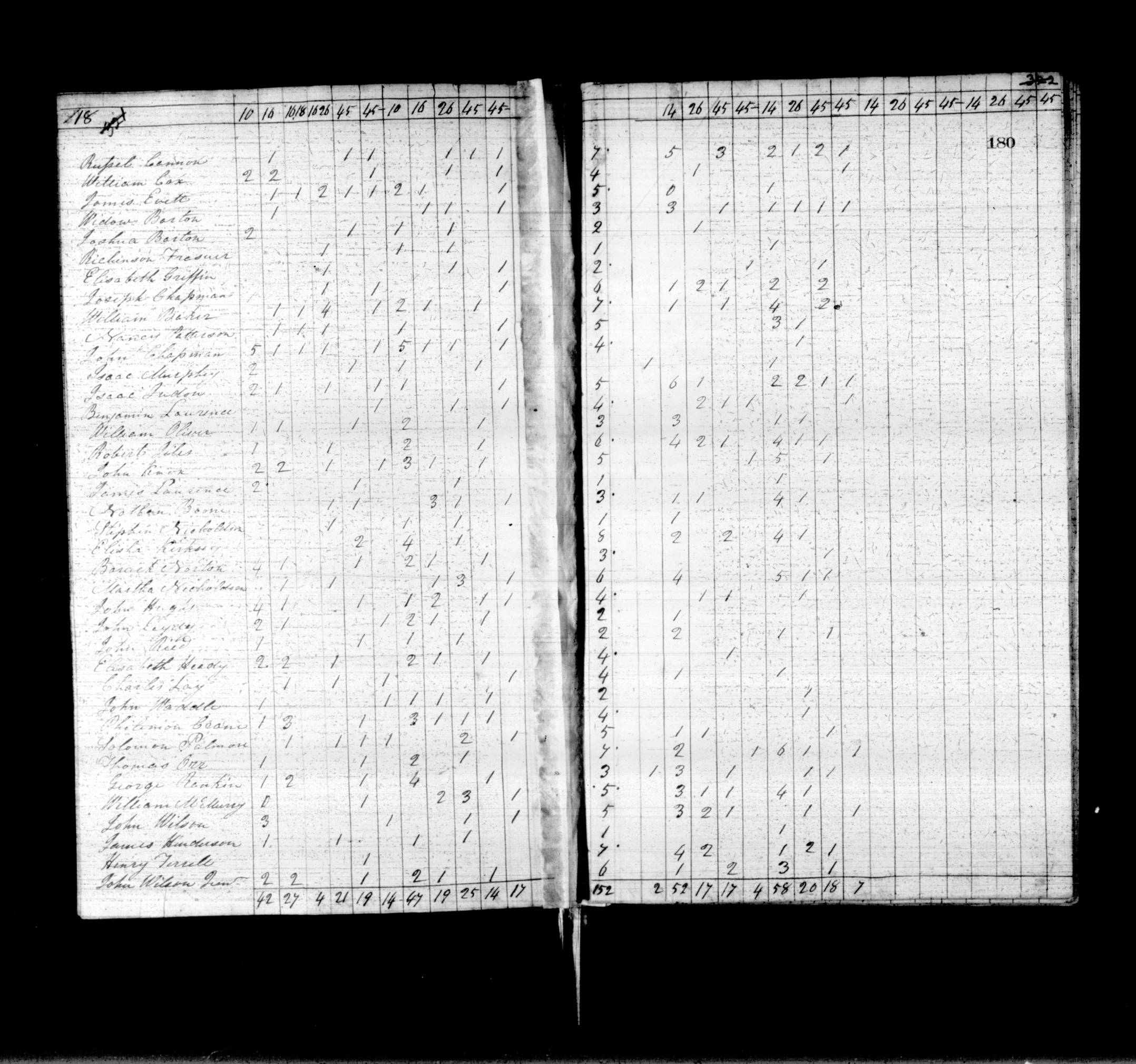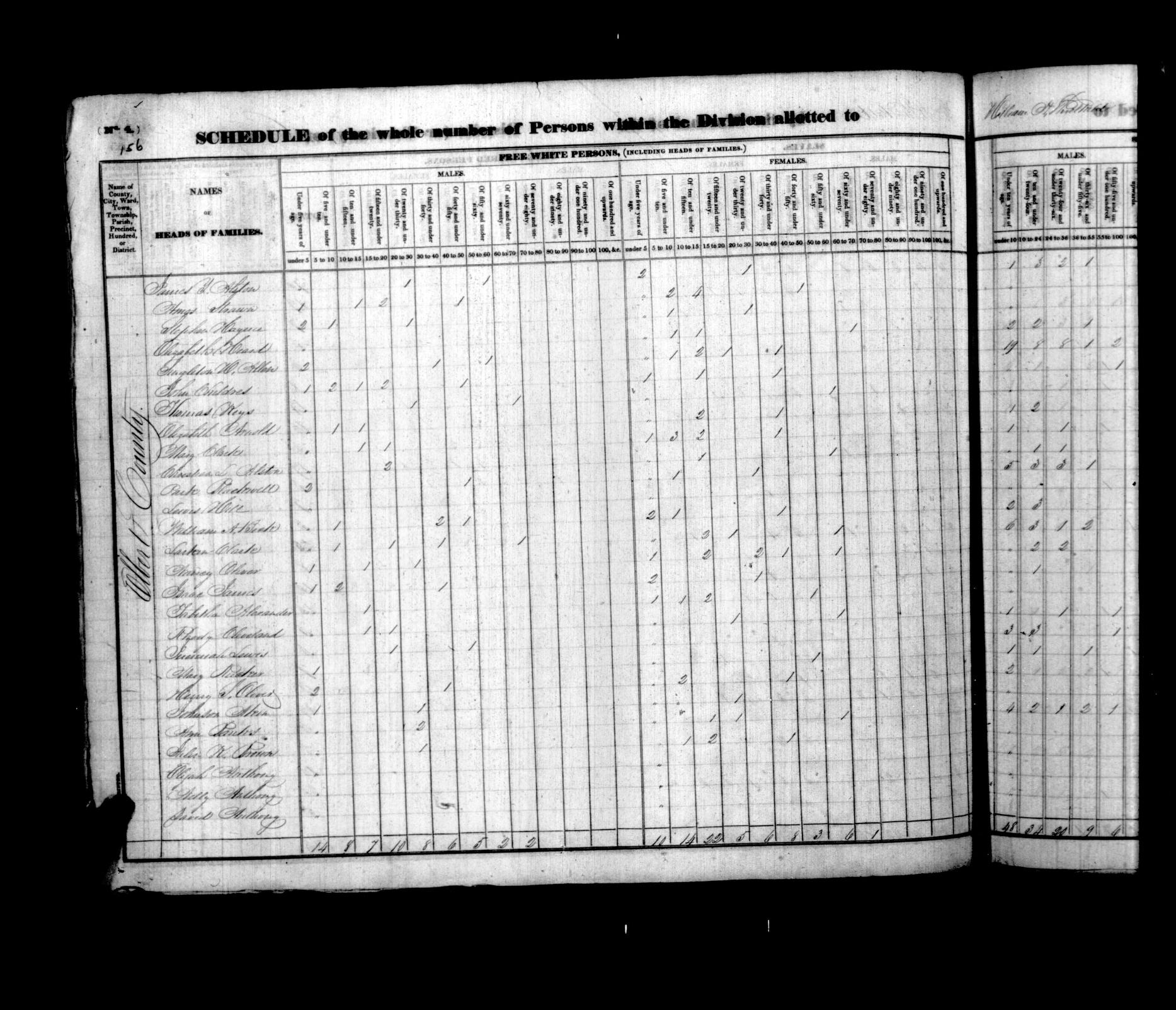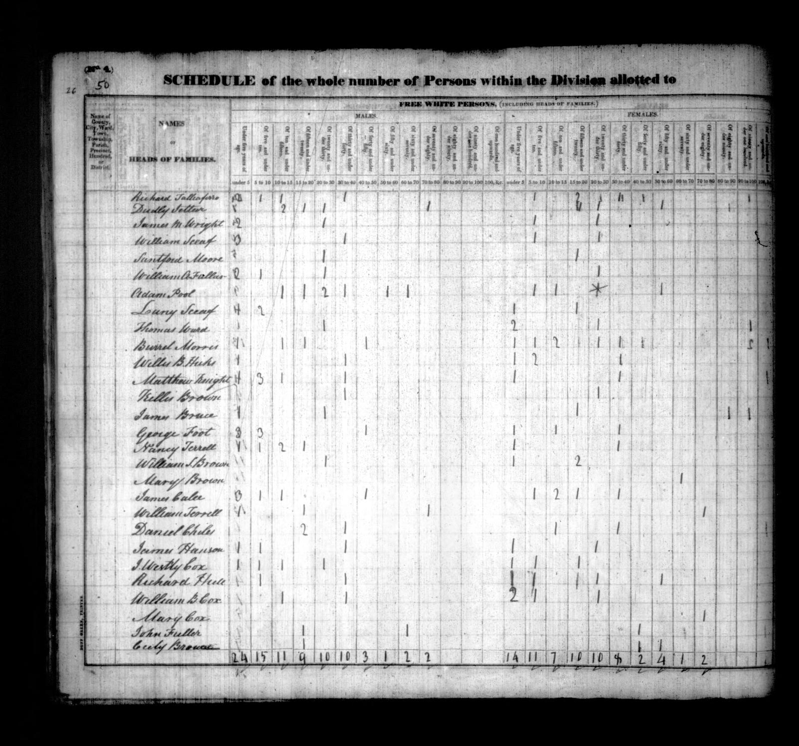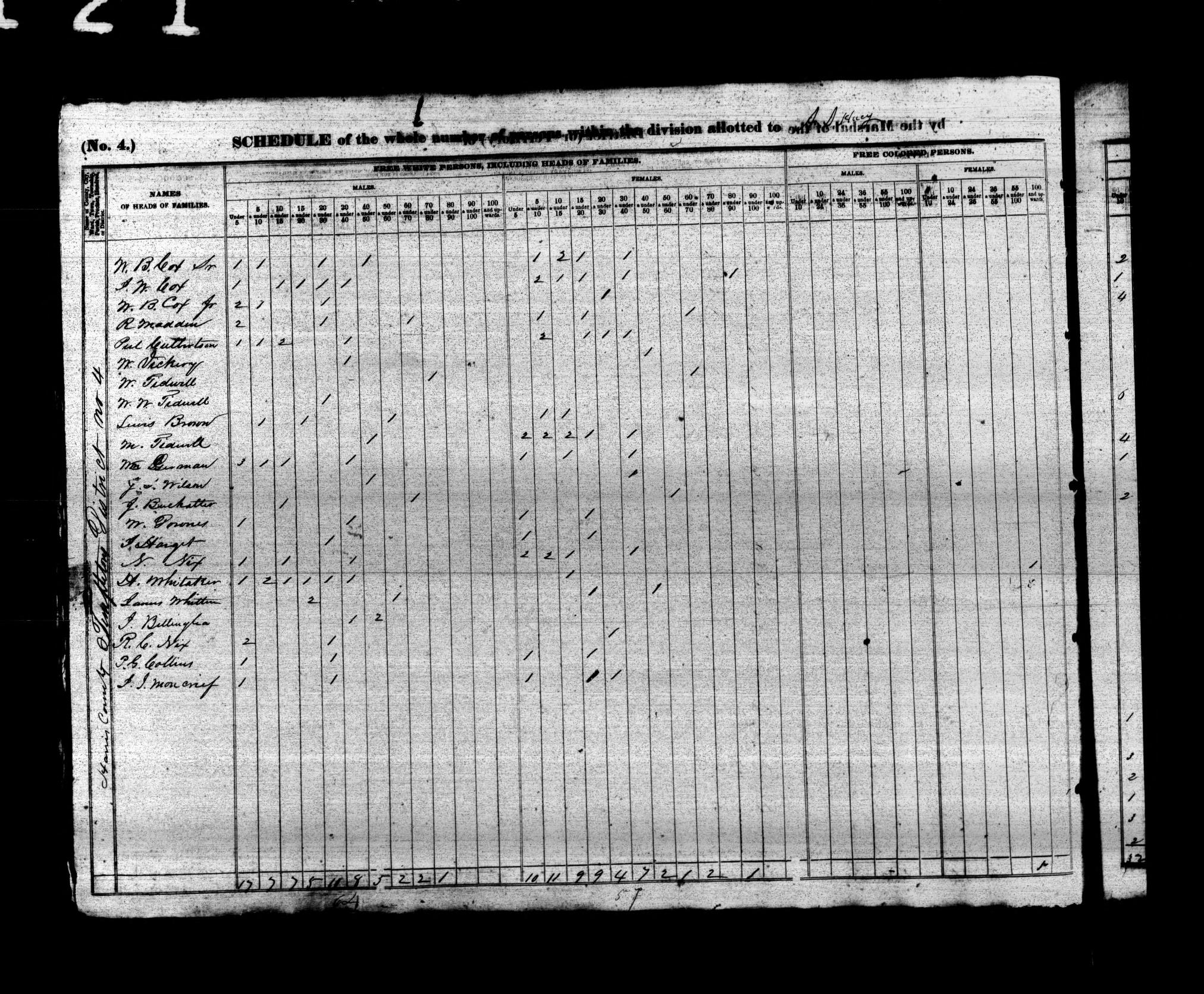 Page 134, line 7 - George Cox 40/50 wife 40/50,males (1)20/30, (1)10/15, (2)5/10 & 3 under 5 + females (1)15/20, (1)10/15 & 1 under 5 (Wm B sr brother - boy 20/30 may be Wm B jr and girl 15/20 could be Rhoda)