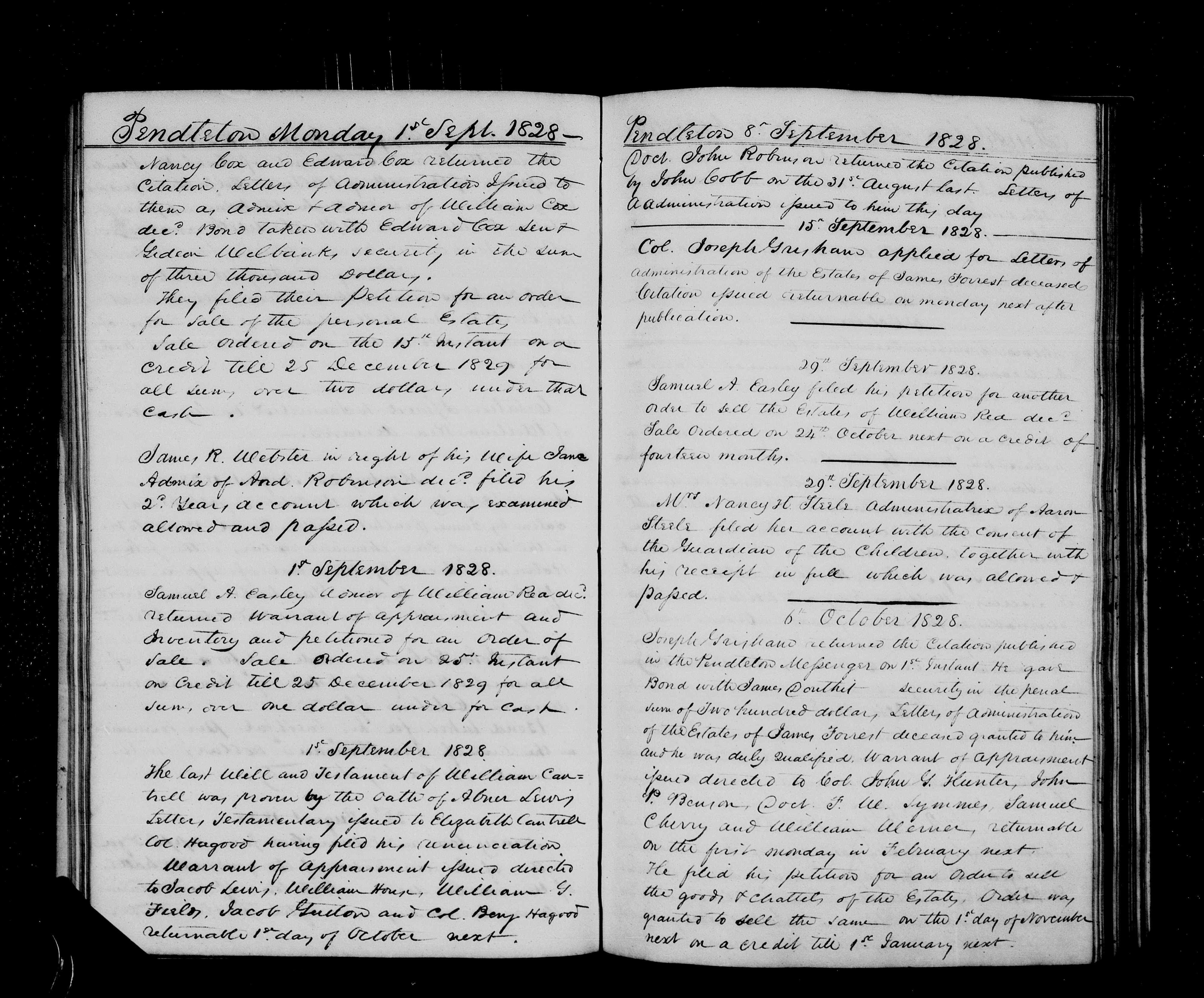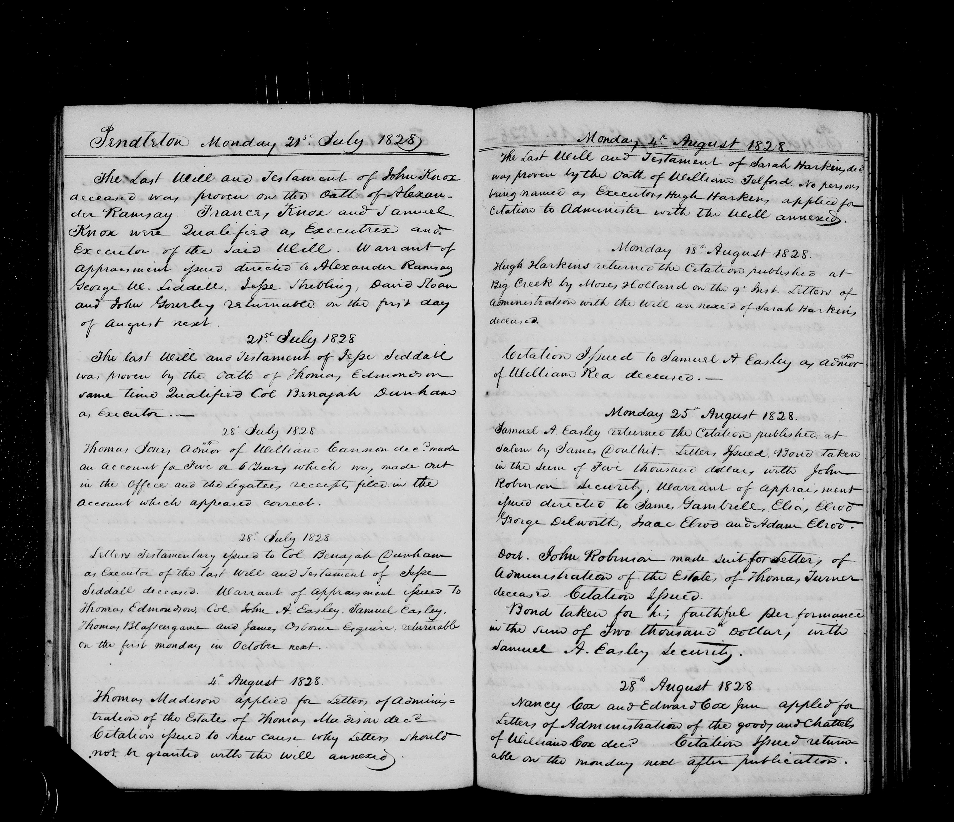 Minute Book in the Court of Ordinary From 29 March 1825; Pendleton District, South Carolina, pg. Pendleton Monday 1st September 1828 found at FamilySearch.com, link: