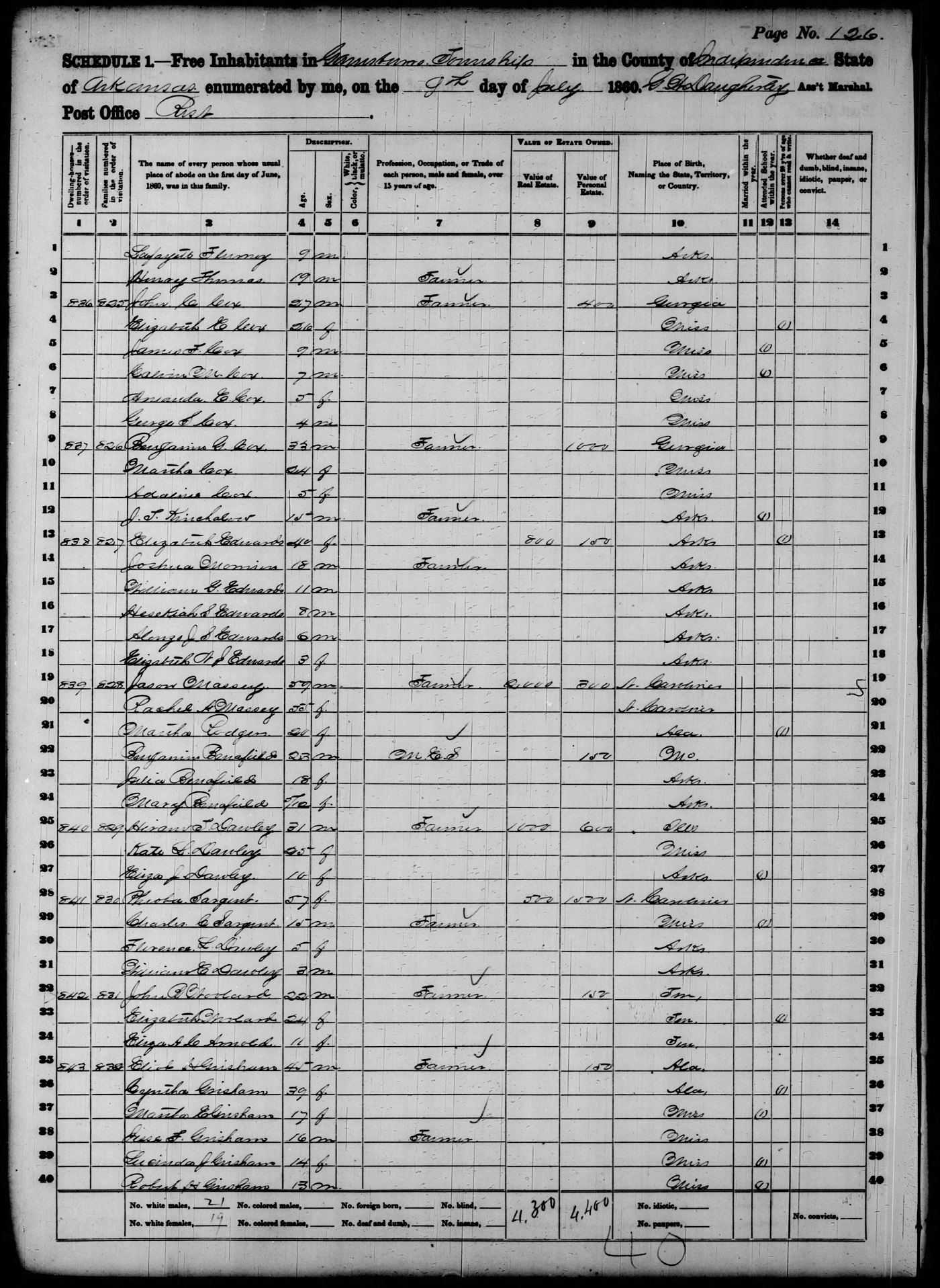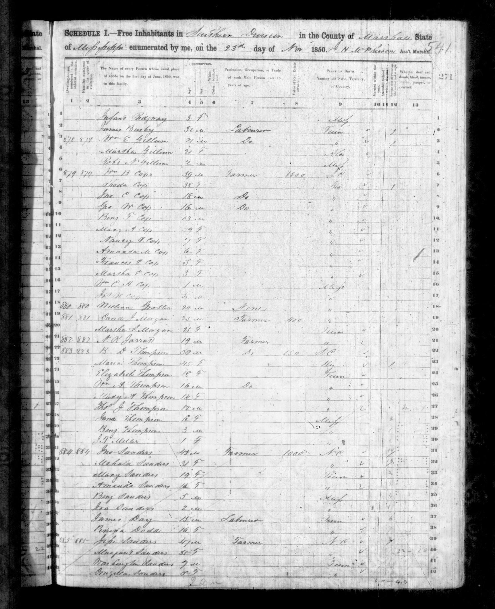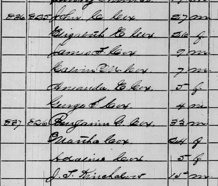 Line 23 - J. Westley Cox 20/30, wife 16/20; males: (1) 10/15, (1) 5/10, (1) under 5; female (1) 5/10 (1) under 5, (J.W. - Wm B brother 20-30, wife? 16-20) (between 20-30)