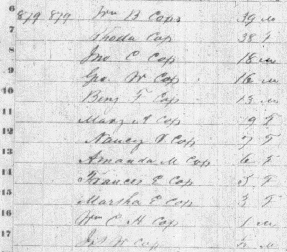Line 11 - Jefre Cox 20/30, wife 30/40, males: (1) 5/10, (2) under 5; females: (1) 10/15, (1) 5/10 & (1) under 5