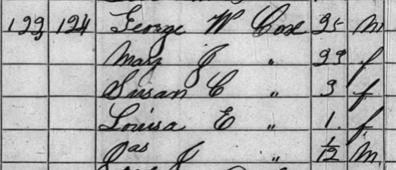 George Cox Pg 33 (or 461) family 769; Age 26-45, spouse 26-45, boys 1 under 10, girls 2 under 10